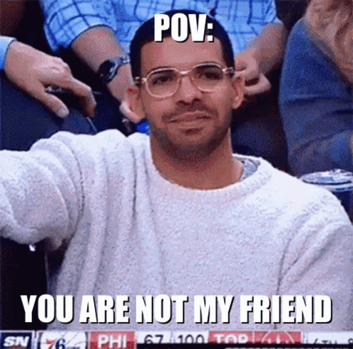 Drake delivers the iconic 'You Are Not My Friend' line in this popular meme, featuring him in a white sweater.