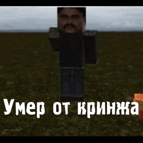 A blocky character with a mustache collapses into a ragdoll, accompanied by the Russian text 'Умер от кринжа' (Died from cringe).