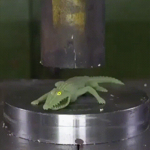 A green toy crocodile, Serega, is dramatically crushed by a powerful hydraulic press, bursting under pressure.