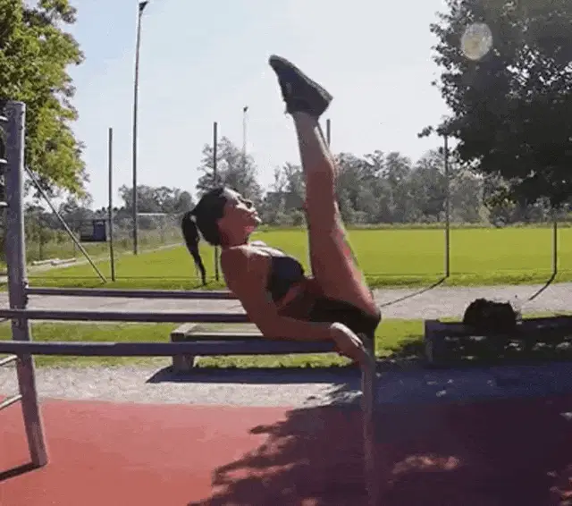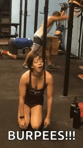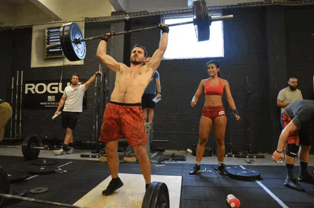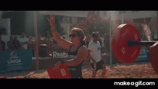 Woman performing a weightlifting rep at a Crossfit event with a UNIQA sign in the background.