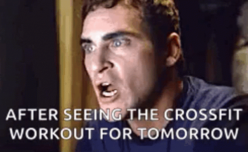 A man reacts with a shocked and scared expression after seeing the CrossFit workout for tomorrow.