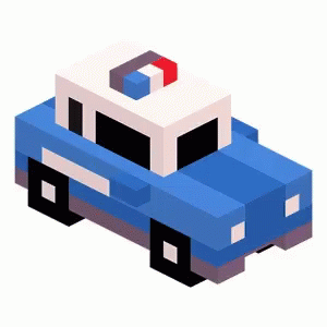 A pixel art police car from Crossy Road, featuring a blue and white design with a flashing siren light.