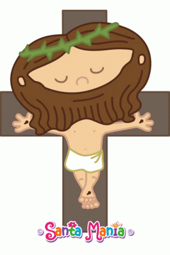 Cartoon Jesus transforms from crucified to joyful, offering hugs and blessings with Santa Mania.