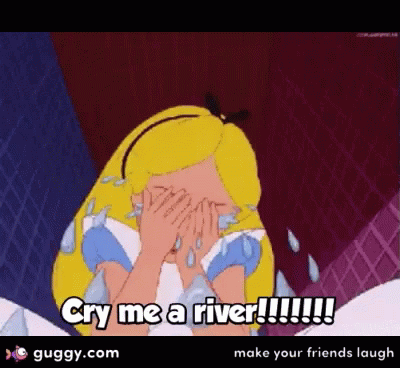 Alice from Alice in Wonderland cries profusely, covering her face, with the text 'Cry me a river!!!!!!!'.