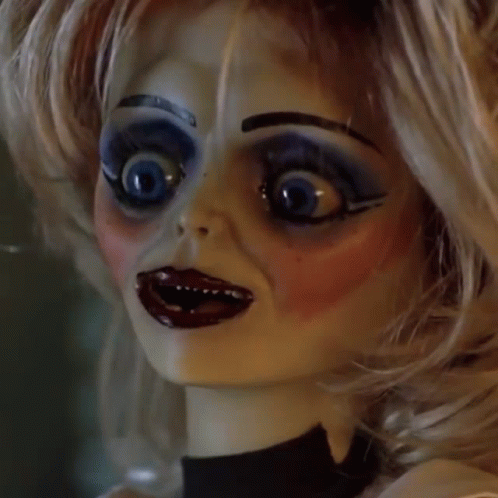 A close-up of the Tiffany doll, known from the Chucky franchise, with heavy makeup and a tear rolling down her face.