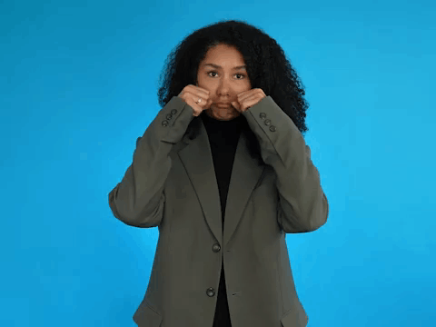 Janine makes a funny, exaggerated crying face, puffing out her cheeks and looking sad.