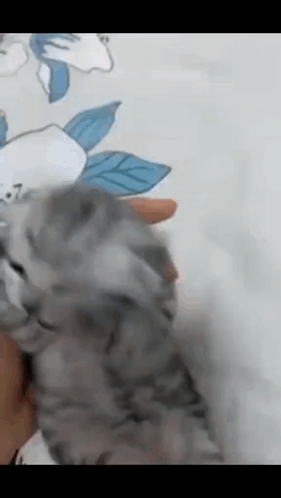 Adorable grey kitten yawns widely, stretching its tiny paws while being gently held by a person.