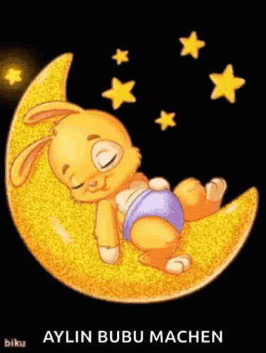 Cute cartoon bunny sleeping peacefully on a crescent moon under a starry sky, featuring 'Aylin Bubu Machen' text.