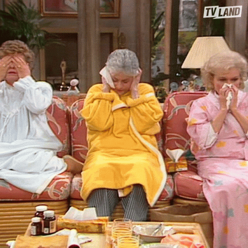 Blanche Devereaux and her Golden Girls friends are feeling unwell, sitting on the couch with tissues and remedies.