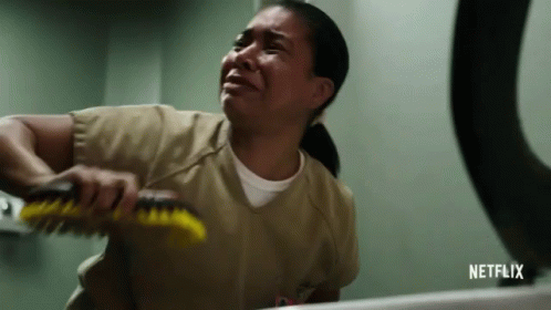Maria Ruiz (Jessica Pimentel) in Orange Is The New Black, crying and stressed in her uniform.