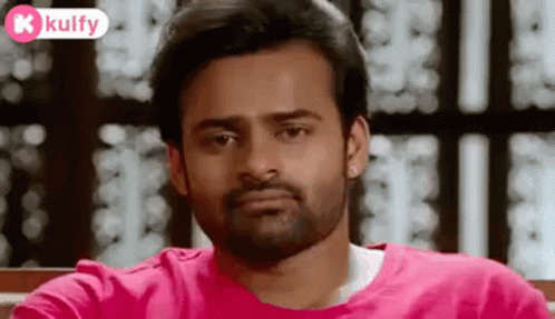 Sai Dharam Tej in an emotional scene, wiping tears while wearing a pink t-shirt, conveying deep sadness.