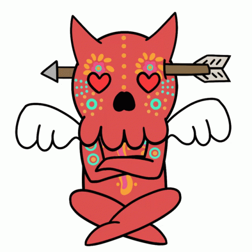 Cartoon red devil character, Cryptomorie Memento Mori, sitting with a cupid's arrow piercing its head.