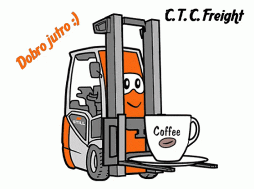 A cheerful CTC Freight forklift cartoon delivers a coffee cup with a 'Good morning' message.