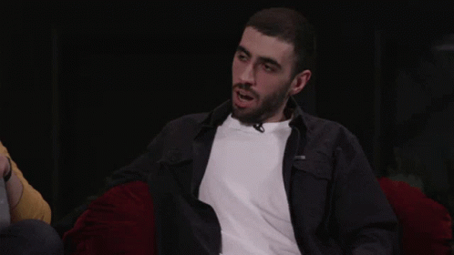 A man, likely Arsen Chaparyan from 'Что было дальше?', yawns widely while sitting on a couch.