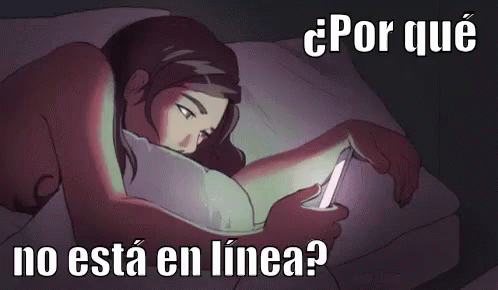 A woman lies in bed at night, illuminated by her phone, wondering why someone isn't online.