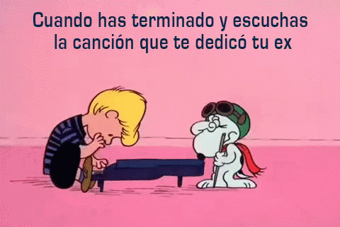Snoopy and Linus react to hearing a song dedicated by an ex, a relatable meme about post-breakup feelings.