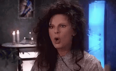 A woman with wild, messy hair reacts humorously to being told to comb it, gesturing dramatically.