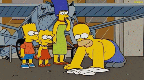Homer Simpson kneels on the ground while Bart, Lisa, and Marge Simpson watch him, near an airplane.