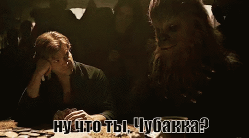 Han Solo and Chewbacca from Star Wars sit at a table with coins, with Russian text 'Well, what is it, Chewbacca?'