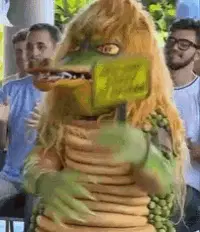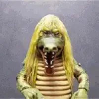Cuca, the iconic alligator-like character with long yellow hair and a ribbed body, turns to face the camera.