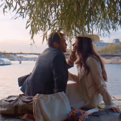 Sena and Yamac share a tender, romantic moment by the river in Paris, under the shade of a tree.
