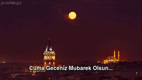A beautiful full moon illuminates the iconic Galata Tower and a mosque in Istanbul, with a blessed Friday message.