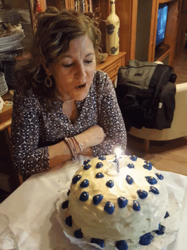 A woman celebrates her birthday, blowing out a candle on a cake decorated with blueberries.