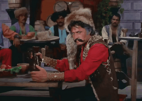 Cüneyt Arkın, wearing a fur hat and mustache, gives an intense look while holding a jug in a tavern setting.