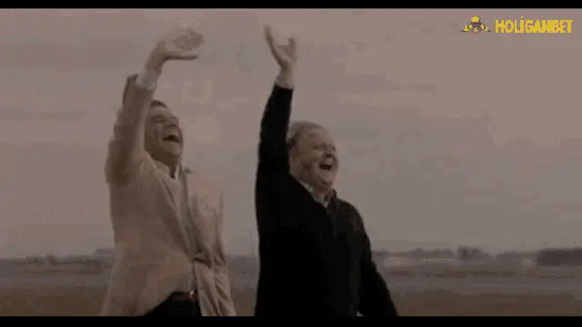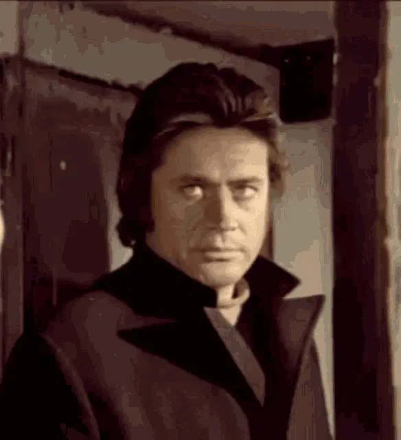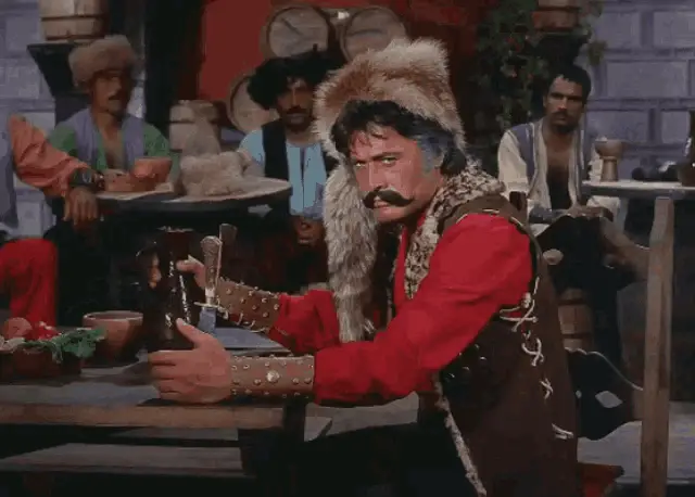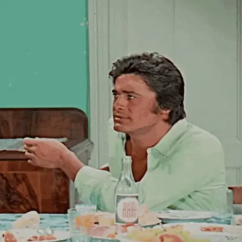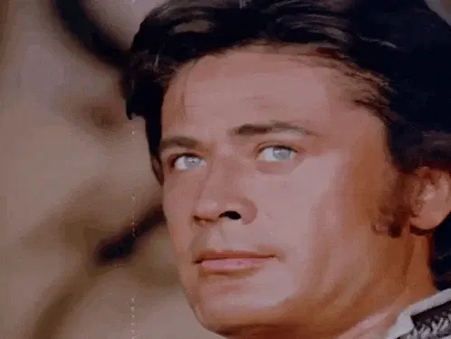 Cüneyt Arkın, a man in a blue shirt, looks sad as Turkish text 'Hoşçakal düşman beldenin yaman güzeli' appears.