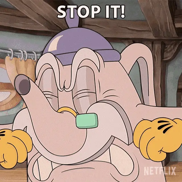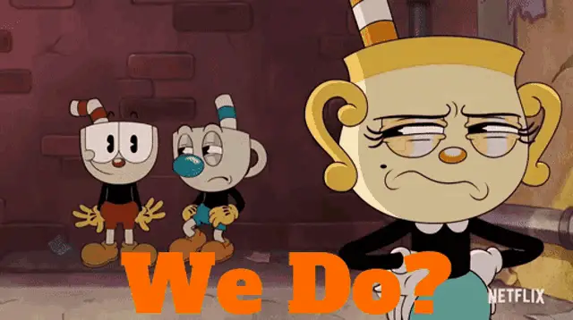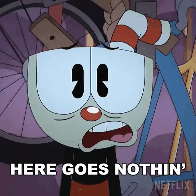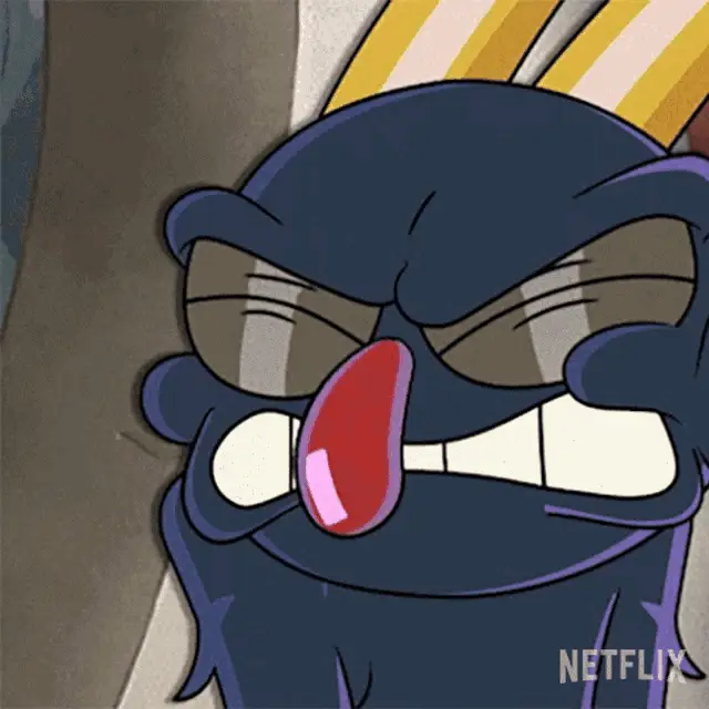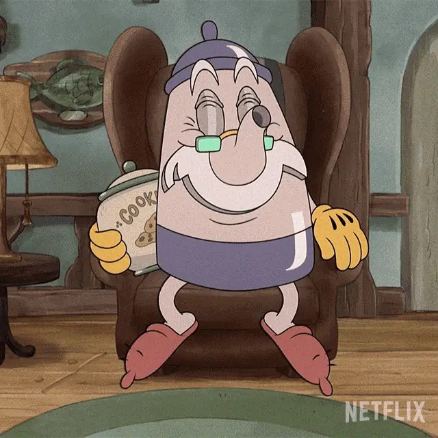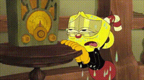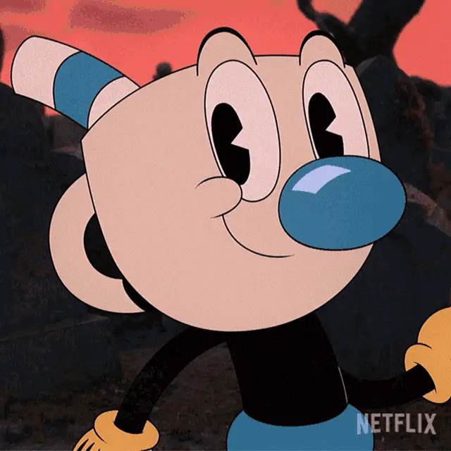 Cup Head Xicrinho cries intensely next to a wooden table, then dissolves into sparkling golden particles.
