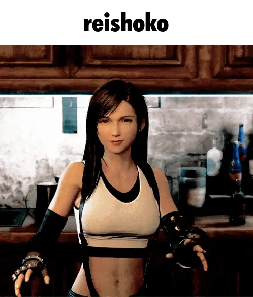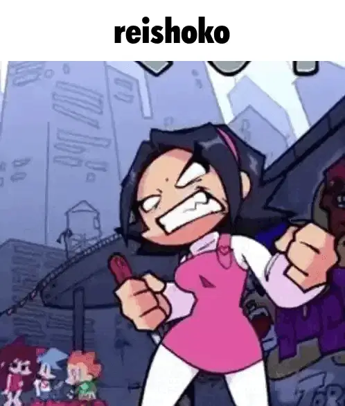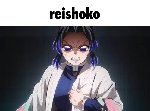 a girl with purple hair is holding a mirror and the word reishoko above her
