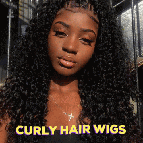 A woman showcasing beautiful curly hair wigs, highlighting the natural texture and style.