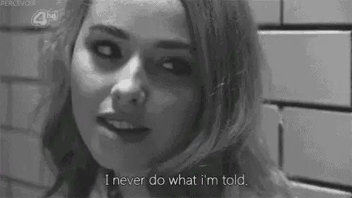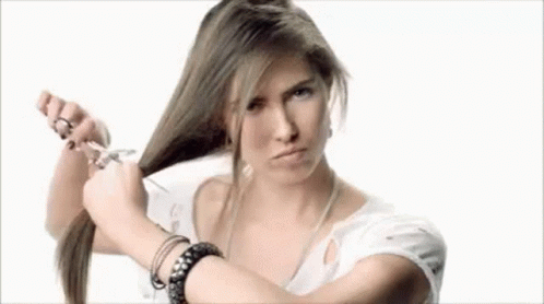 A woman dramatically cuts off her long hair with scissors, transforming her look to a short style.