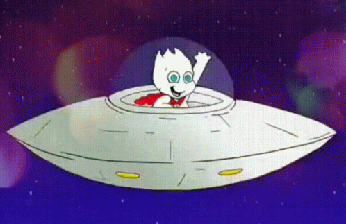 Cute cartoon character Sporky, a white alien with a red cape, waves from a UFO in space.