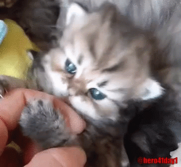 An adorable fluffy kitten with bright blue eyes gently plays and nibbles on a human finger, showcasing its playful nature.
