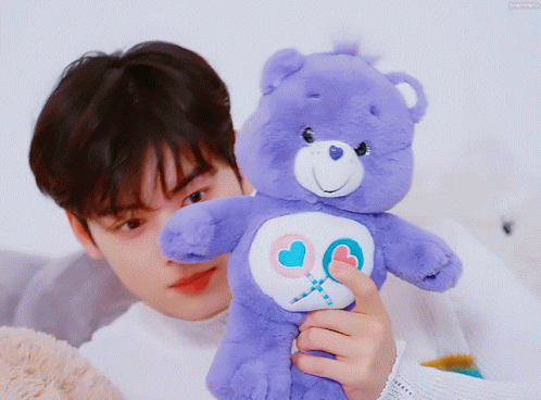 Cha Eunwoo, a member of ASTRO, holding a cute purple Care Bear plushie.