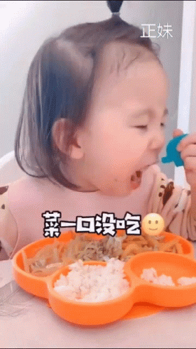 A cute baby girl with a ponytail sits at a high chair, refusing to eat vegetables and only picking at rice.