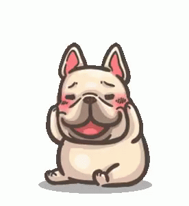 An adorable cartoon French Bulldog blushes and smiles, looking shy and happy.