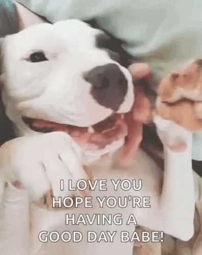 Smiling Pitbull puppy with a heartwarming message: 'I love you hope you're having a good day babe!'.