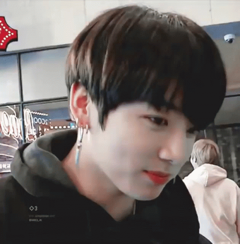 Jungkook flashes a charming and cute smile while wearing a black hoodie.
