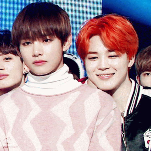 Jimin of BTS, with bright orange hair, smiles playfully behind V (Kim Taehyung) who wears a pink patterned sweater.