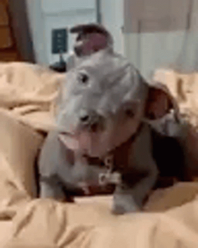 Adorable grey puppy sitting on a soft bed, looking around curiously with a sweet expression.