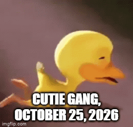 Animated yellow duck meme with text 'CUTIE GANG, OCTOBER 25, 2026' appearing on screen.