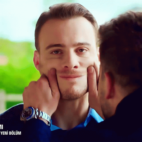 Kerem Bürsin's cheeks are playfully pulled by another man, creating a forced smile.