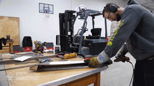 A man cutting and polishing a metal piece for a Cybertruck build in a workshop, using a grinder.
