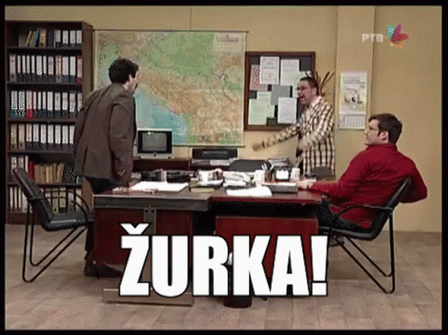 Cvarkov and colleagues from Državni Posao react to the word 'ŽURKA!' (Party!) in their office.
