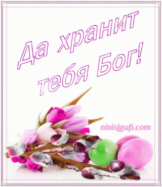A vibrant Easter greeting card featuring pink tulips, pussy willow, and colorful eggs, with the message 'May God keep you!'