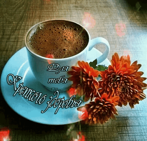 A warm cup of coffee with beautiful flowers, wishing 'For you, good health' in Russian.
