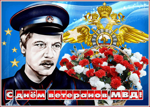 Greeting card for Russian Ministry of Internal Affairs veterans, featuring a police officer and a basket of flowers.