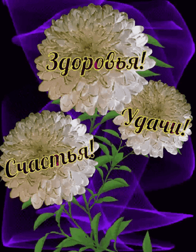 Three white flowers on a purple background with Russian wishes for health, good luck, and happiness.